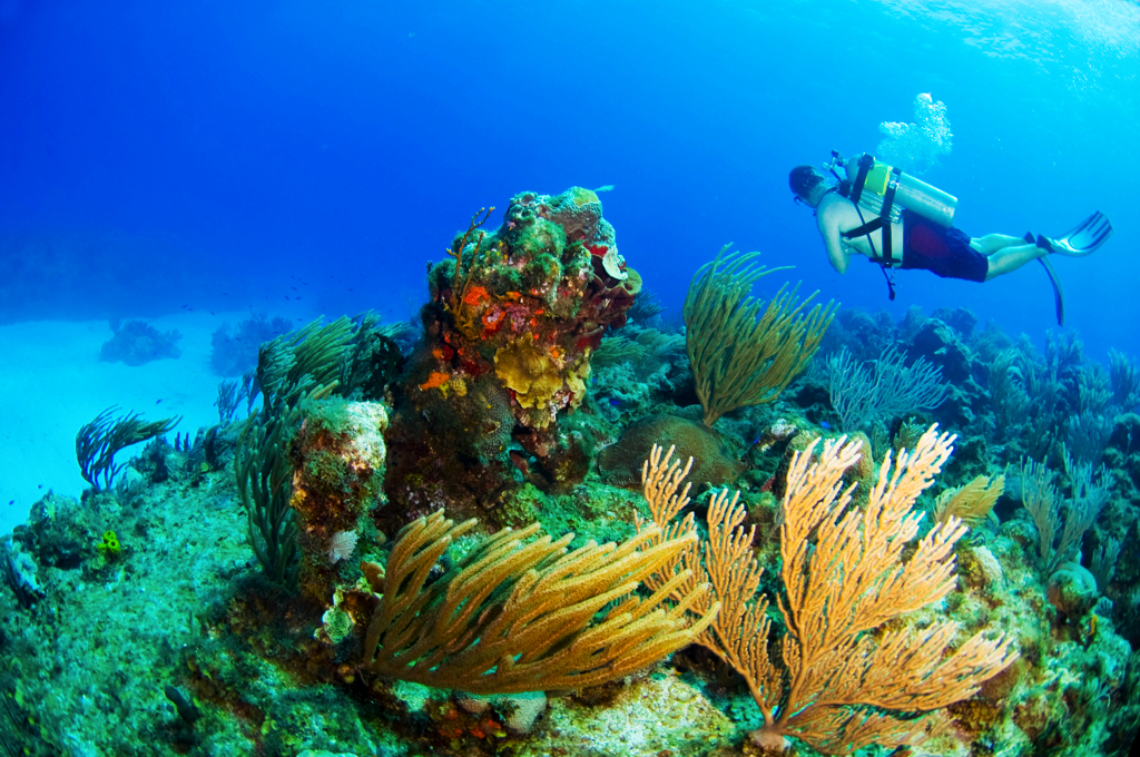 Grand Cayman, the largest of the 3 Cayman Islands, is horse-shoe shaped. At about 22 miles long and 2 to 8 miles wide it lies west of Jamaica and south of Cuba in the central Caribbean. It is part of an underwater mountain range running between Cuba and Belize, and is alongside the deepest part of the Cayman Trench, with depths down to 4 miles (6 Km). It is surrounded by coral reefs, home to an abundance of coral fish, crustaceans, coral, turtles, rays and passing pelagics. Its waters are warm the year round with an average temperature of about 82F (28C). Viability, the envy of the rest of the Caribbean, is usually around 100ft (30m). But what makes Grand Cayman unique amongst dive destinations is the abundance of world class dives within easy reach of the shore. Pick almost any point along the east, south or west of the island and there will be a wall of coral within a short swim from the beach.