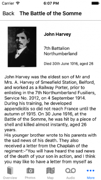 - The photo gallery and supporting information sections of the app are where you'll find the extra information on the brave men of Northumberland